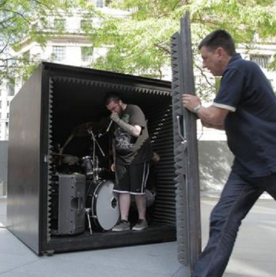 I quote: “The box is soundproofed, determining and restricting the performance’s duration to the length of time in which the oxygen is expended…Outside the cube, viewers observe its strange vibrations, only viewing the band’s entrance and exit to the performance space.”