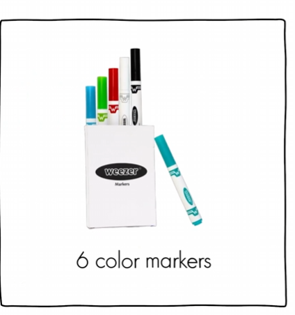 “We’re releasing all of the colored albums together for the first time ever. May we present to you, the Weezer Coloring Book Vinyl Box Set. Blue, Green, Red, White, Black, and Teal all together in one place. 6 LPs on colored vinyl, 72 original illustrations by Alec Longstreth, 6 color markers (including one magic marker. Use it on the cover & vinyl jackets to reveal hidden surprises!), and it’s even Karlification certified.