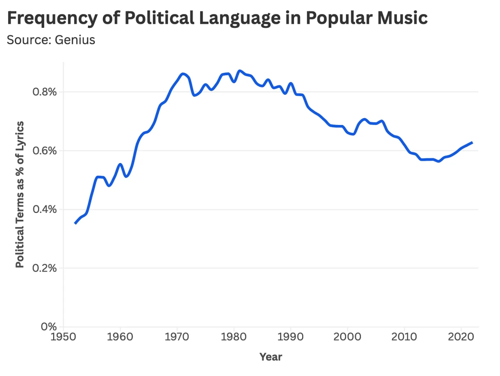 So, yes. Political language in music has increased, but it’s still below its historic peak. Rock continues to lead the way with the most political lyrics (0.74% of songs) followed by country (0.60%) and rap/hip-hop (0.58%).