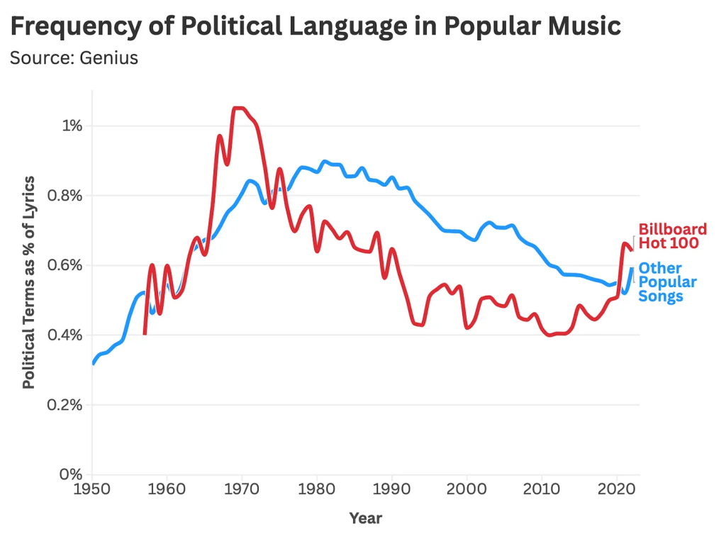 Here’s a slightly different graph that focuses on political songs on the Billboard Hot 100. And yes, there’s an uptick.