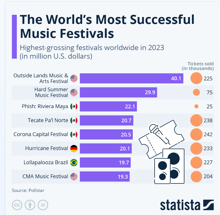 But festivals aren’t going away; it’s just that we’re in a down part of the cycle that still has a chance to be corrected. Statista has this graph of the world’s highest-grossing festivals from last year. It’ll be interesting a year from now to see how things may have changed.