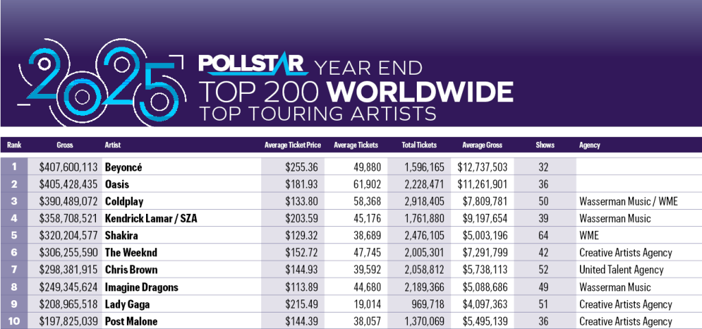 Pollstar has released its year-end charts for live music in 2025