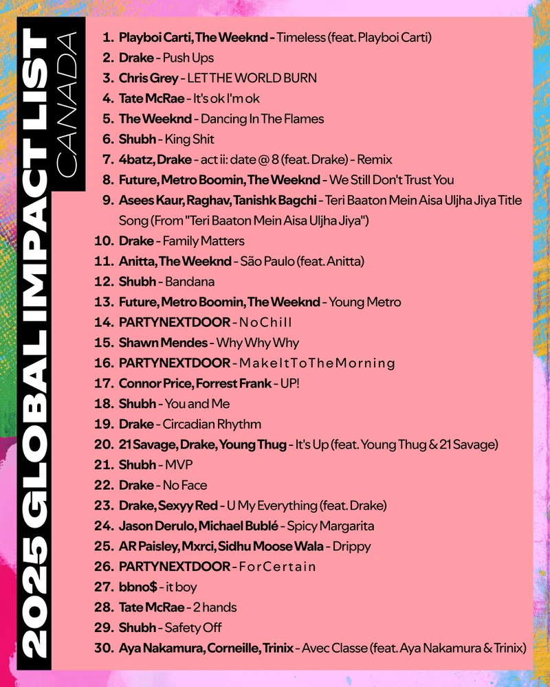 Spotify has just released its first-ever Global Impact List for Canada, compiling stats for the most-listened-to Canadian songs on the platform. Some of the usual suspects are here (Drake, Weekend, Tate McCrae, etc.) but there is also a surprise or two. For example, who’s Chris Grey? A Canadian who is a star in Brazil, Maylasia, and Indonesia. Shubh and Raghav are Canadian but have major appeal to Punjabi fans worldwide.