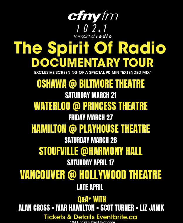 The CFNY: The Spirit of Radio documentary is coming to theatres Here’s advance ticket info for Oshawa, Waterloo, Hamilton, Stouffville, and Vancouver