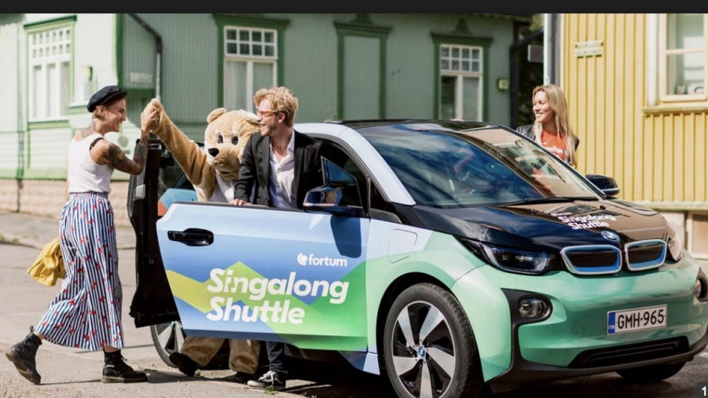 A BMW i3 electric car has been pressed into service. The only currency the driver will accept is singing.