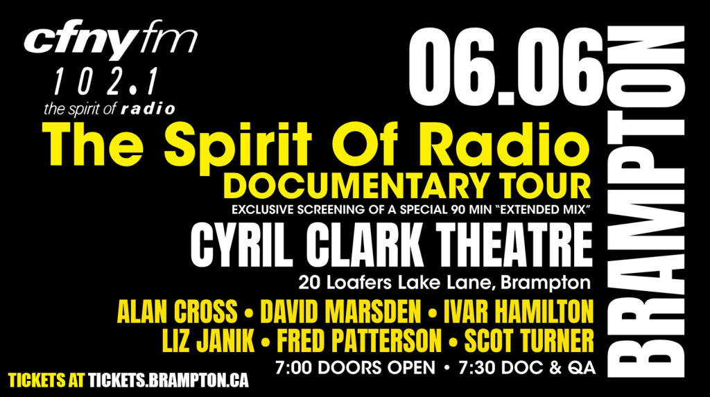 Theatrical screenings of CFNY: The Spirit of Radio Documentary continue. Here’s what’s left on the schedule: Stouffville, Vancouver, Buffalo, and just announced, Brampton