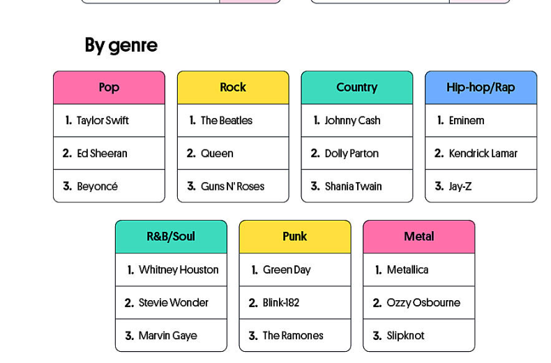 - Rock — The Beatles, Queen, Guns N’ Roses