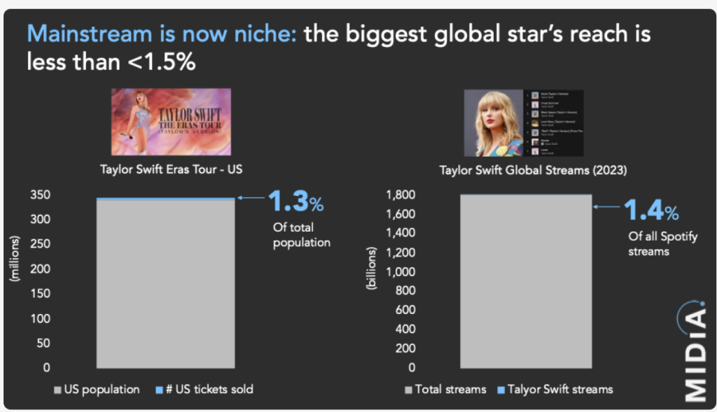Check out this Midia chart. Pre-internet, the biggest global stars would have far greater penetration into our psyches. Taylor Swift bigger than The Beatles? Hardly. (If you want to go into the weeds to discover why this is so, go here.)
