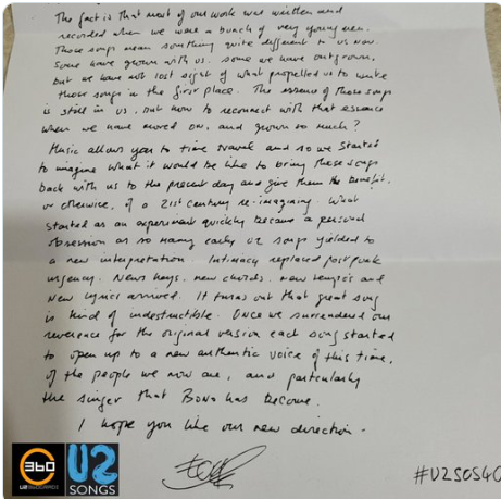 Anyone know what the “40” might allude to? At the top of the letter a number between one and 40, which may indicate that only 40 letters were sent out. There’s also the story that the album will feature 40 U2 songs that have been re-recorded. The title of the album is also spelled out in Morse code.