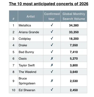 A concert company called Fanatix did some sleuthing to find out which acts are getting the most search queries. Here’s what they came back with, even though some of these artists don’t have any confirmed dates so far.