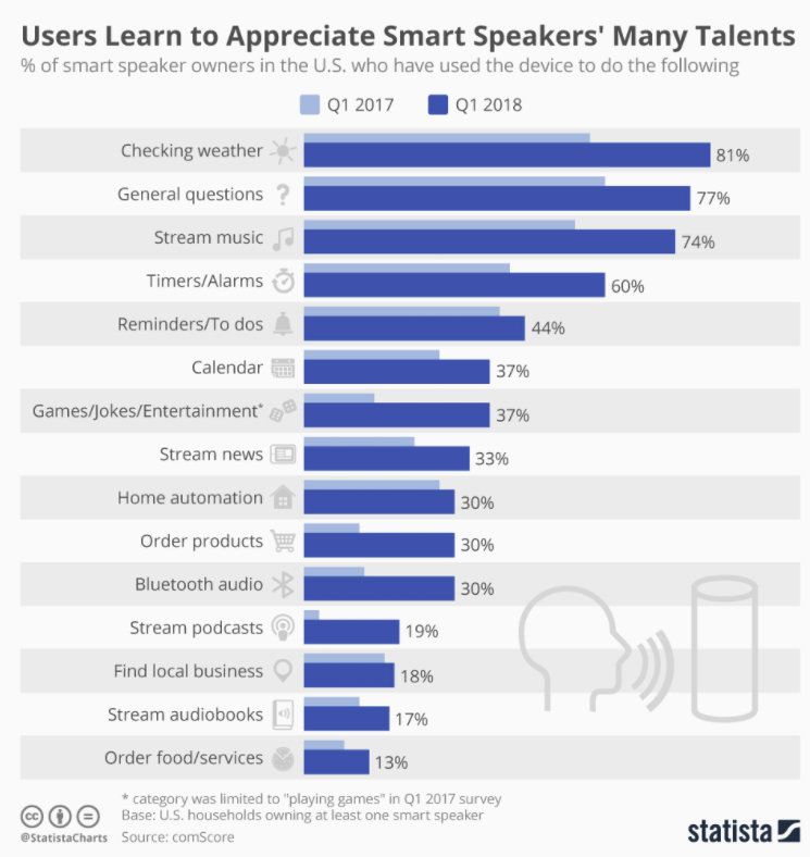 Smart speakers are all the rage, the fastest-growing segment of the consumer electronics arena. But what once they buy them, what are they being used for? Statista has this chart.